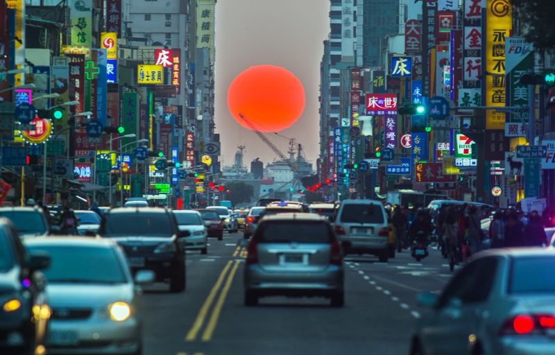 ▼所謂的「懸日」是指太陽落下時,夕陽剛好介於兩棟建築物之間,餘光灑滿城市內的街道,呈現超壯觀的景象!一開始懸日是指在美國紐約曼哈頓所出現的自然現象,每年的5月28日和7月12日都可以在當地看見。(圖為高雄先前的曼哈頓懸日)