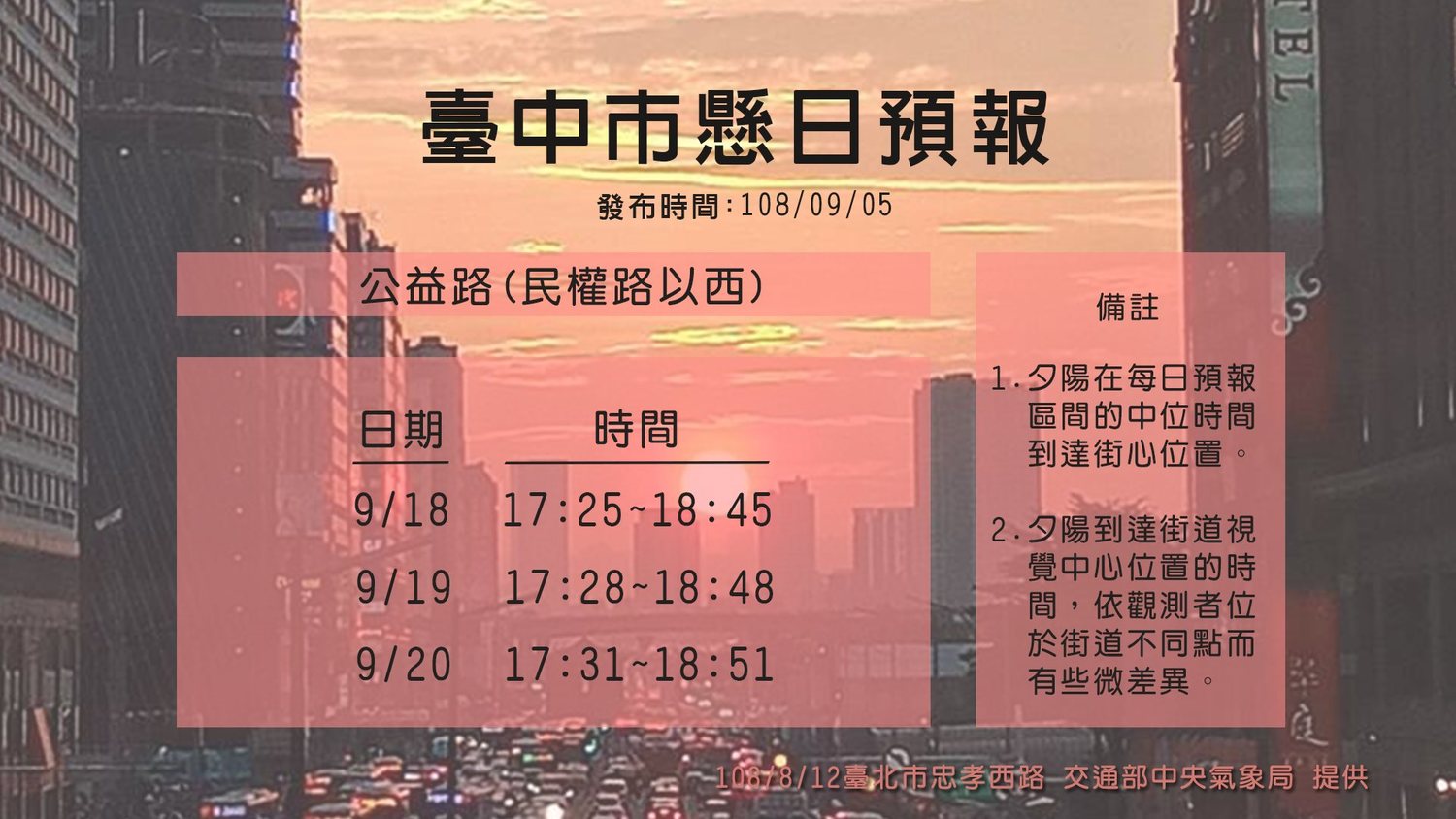 ▼中央氣象局在日前公布了「台中懸日」最佳的觀賞時間與路段,只要在9月18日至20日(星期三至五)傍晚,於台中市公益路在無雲遮下將可觀看到懸日景象,就可以拍攝到罕見的懸日奇景!