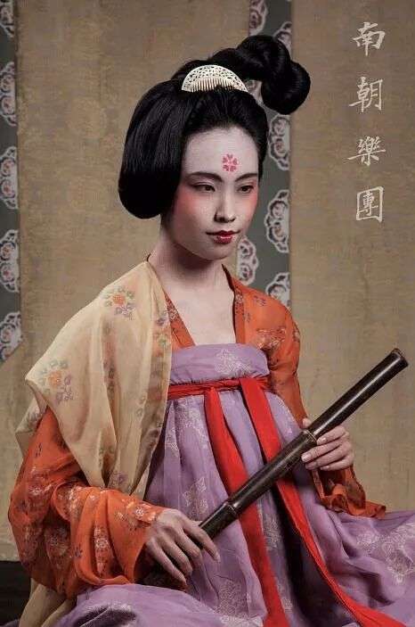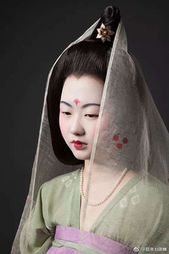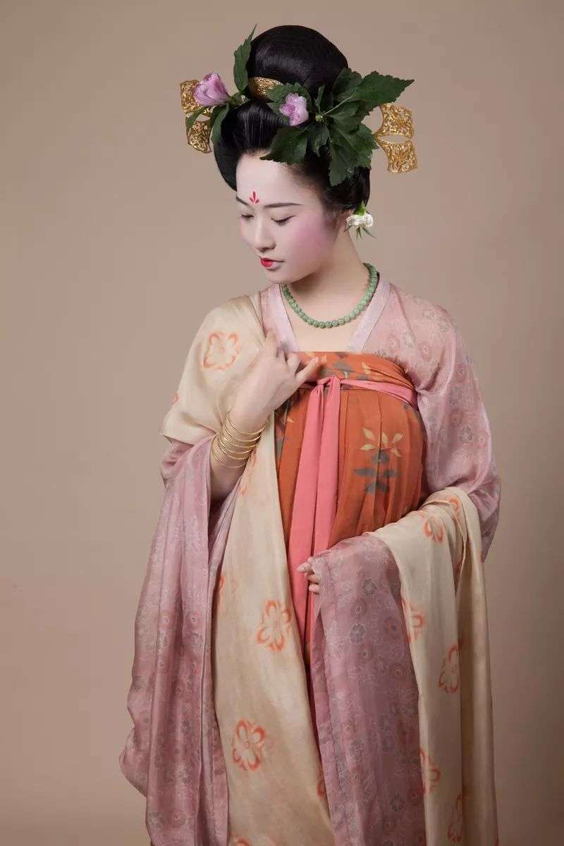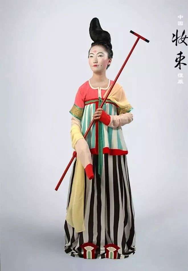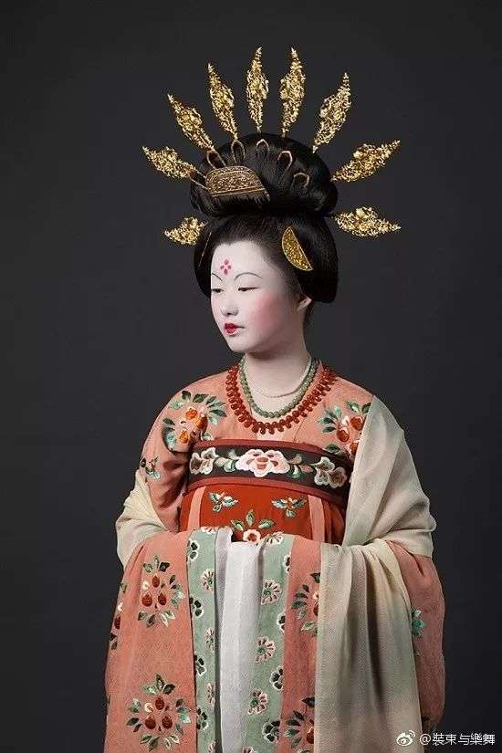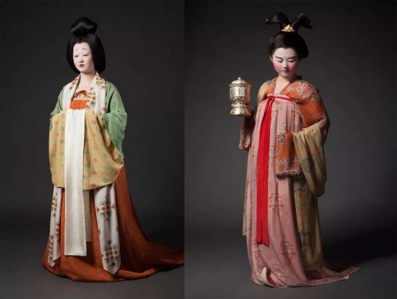 ▼初唐單刀半翻髻,和錦緣半袖襦裙腰裙,是根據龍朔三年(663),新城長公主墓中的壁畫還原的。