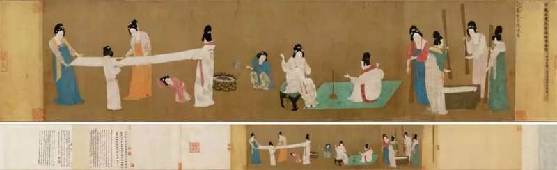 ▼這沒有嚇退那群熱情逐夢的年輕人,實物少,他們就去研究古畫、壁畫。比如唐代張萱的《搗練圖》,就詳細繪製了服裝的形制、配色、花紋,更把製作工藝畫了下來。這幅畫給了小組很大的啟發。