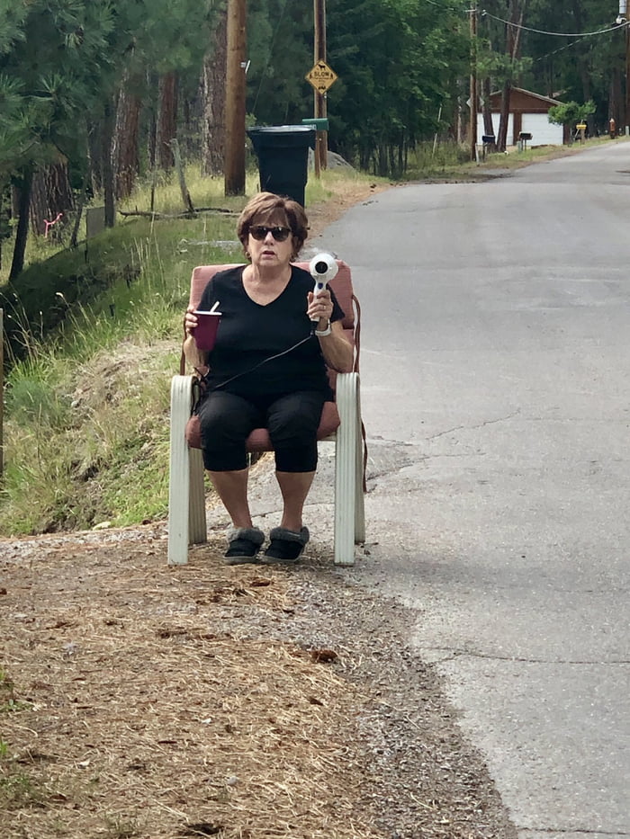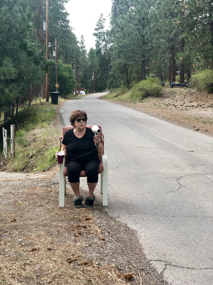 ▼這位叫Patti Baumgartner的阿嬤在路邊擺了一張椅子,她經常坐在那裡,拿著白色的吹風機對準過往的車輛,假裝那是測速器。她說:「我們覺得應該想辦法讓路過的車子慢一些。」