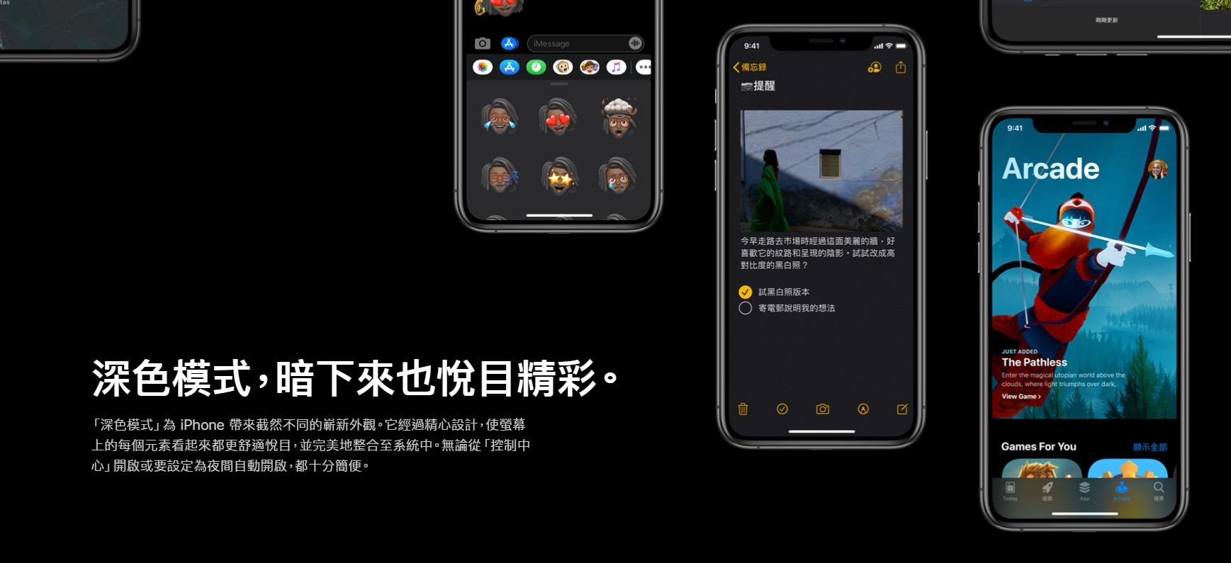 「深色模式」為 iPhone 帶來截然不同的嶄新外觀。它經過精心設計,使螢幕上的每個元素看起來都更舒適悅目,並完美地整合至系統中。無論從「控制中心」開啟或要設定為夜間自動開啟,都十分簡便。