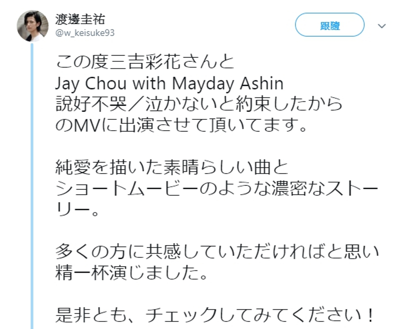 看了MV之後,是不是也陷入了男女主角那迷人的魅力和緊湊的劇情當中無法自拔呢?如果想要知道更多帥哥渡邊圭祐的消息,可以追蹤他的 推特帳號