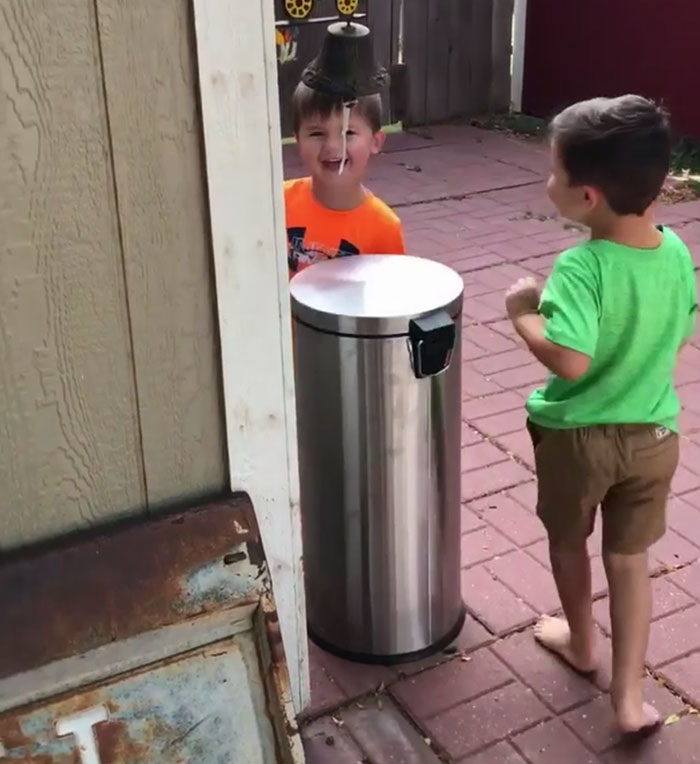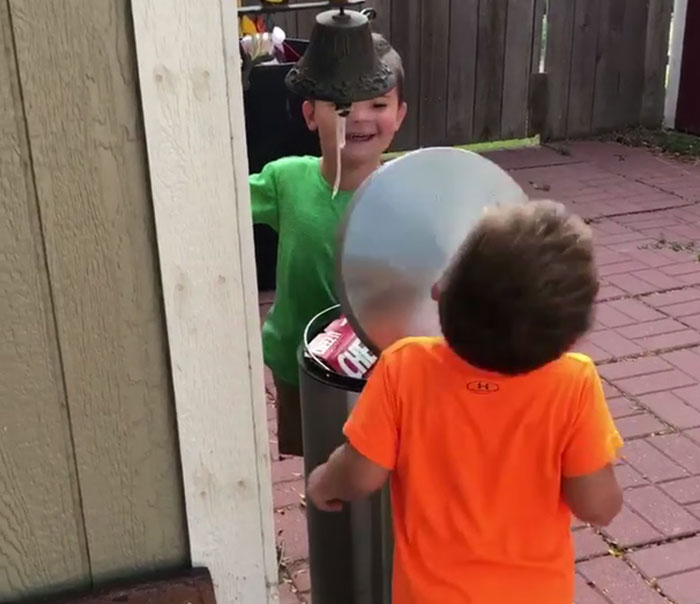 ▼影片裡可以看見2個小男孩,一人負責踩踏板,另一個人就等著被垃圾桶蓋拍飛臉!