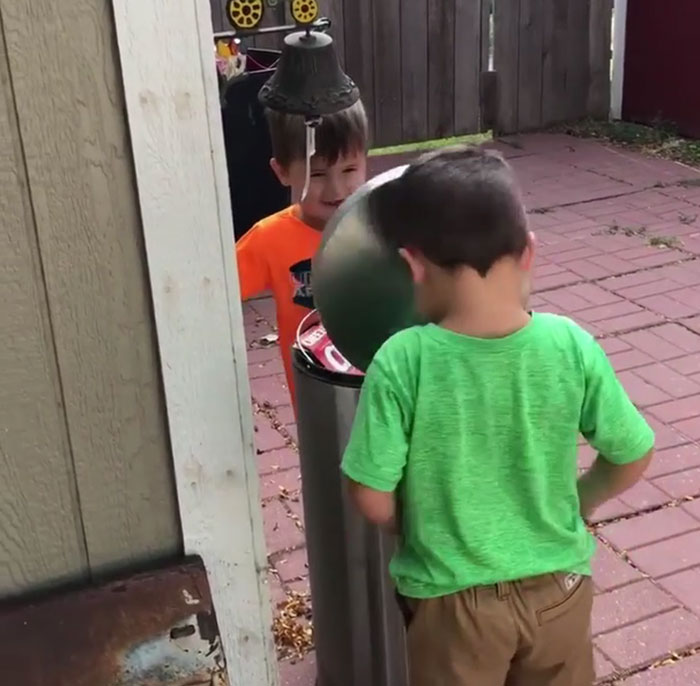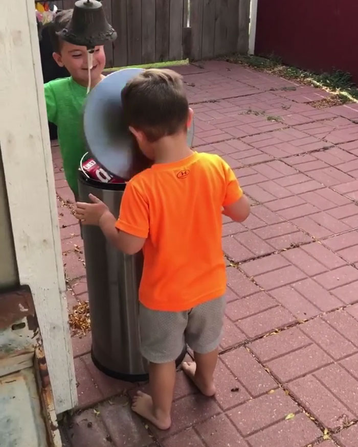 小孩的快樂很簡單,總是能從各種生活小事中找到屬於自己的娛樂。下面這2個男孩就玩一個垃圾桶玩得不亦樂乎,而且玩法竟然是被垃圾桶蓋「直直拍臉」,小男孩玩得超嗨的樣子也忍不住讓網友嘴角失守。
