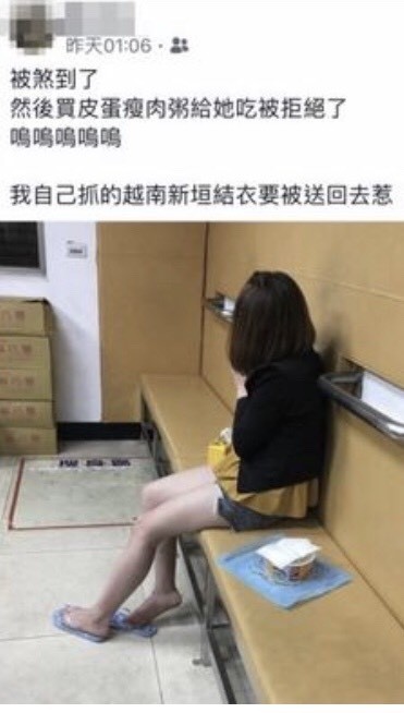 ▼由於阮女的外型太過於亮眼,就連員警也非常不捨,還擔心她深夜肚子餓而去買了一碗皮蛋瘦肉粥給她當宵夜,不過阮女並沒有食用讓員警非常失落,拍下了她的背影並在臉書表示「被煞到了,買的皮蛋瘦肉粥給她吃被拒絕了,嗚嗚嗚嗚嗚」、「我自己抓的越南新垣結衣要被送回去惹」!