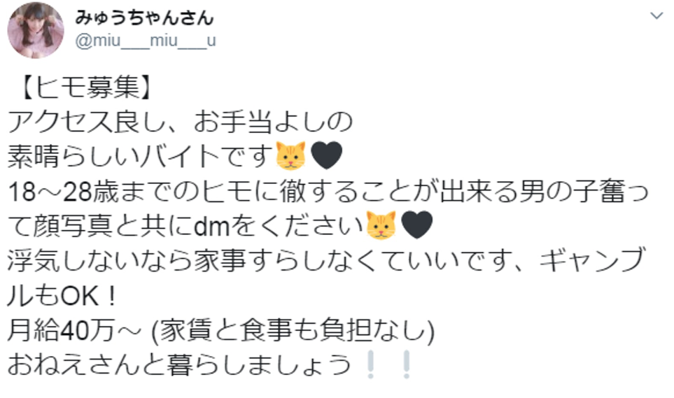 ▼這位美女在推特公開找職業男友,開出的條件包括年齡必須是18至28歲、不用做家務,只要陪她和不會出軌就可以每個月領40萬日圓薪水!