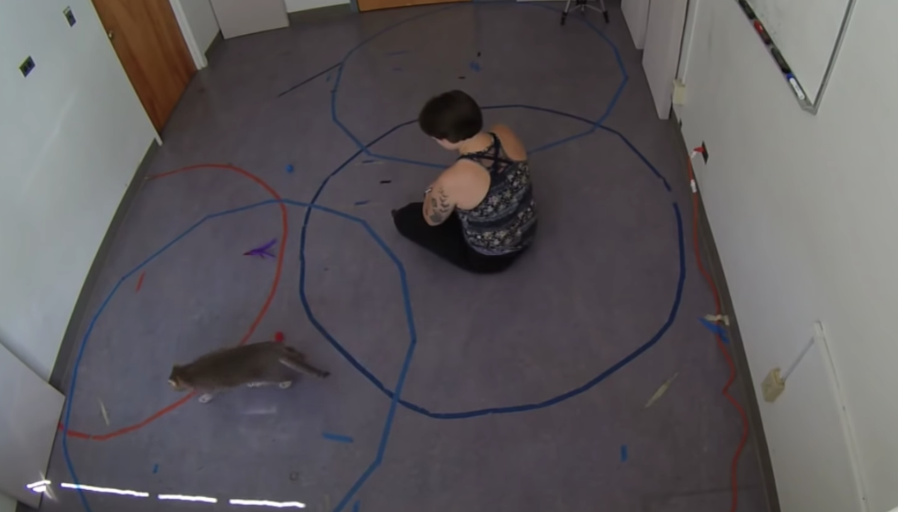 ▼測試過程首先會把貓咪和主人留在同一個室內空間,接著主人會坐在用顏色區分了的圈圈內。主人必須等到貓咪走進圈圈才可以開始互動。2分鐘後,主人就會被指示離開,留下貓咪自己獨處。
