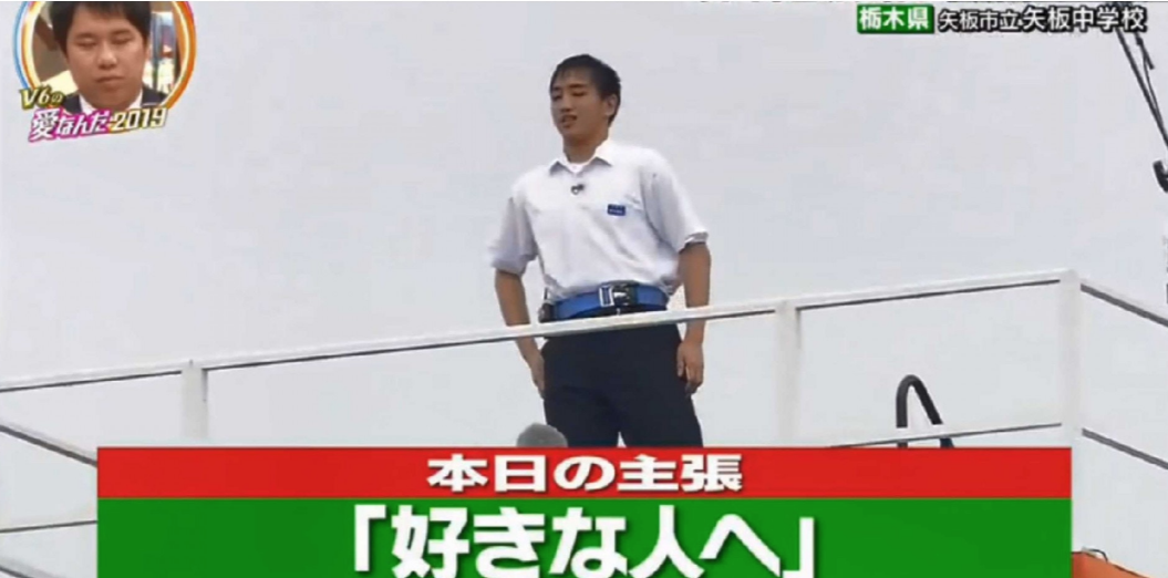 日本經典節目《校園瘋神榜》有一個非常受歡迎的單元叫「未成年主張」,可以讓學生踏上屋頂吶喊心聲。雖然節目已經停播多年,但是最近TBS電視台特備節目《V6の愛なんだ2019》卻讓這個單元復活,而且還有男同學大膽同時跟2女告白!