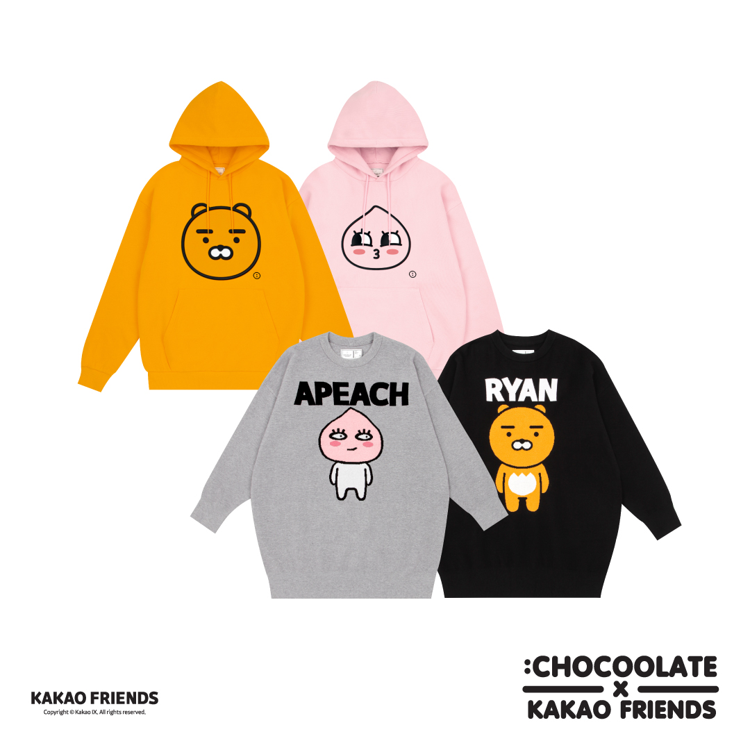 ▼系列延續上季設計主題主要以 Kakao Friends 當中的角色 Ryan 及 Apeach 作主要圖案設計,並以:CHOCOOLATE 慣用色調為主,為了配合人物角色特意加入黃色和粉紅色作點綴。