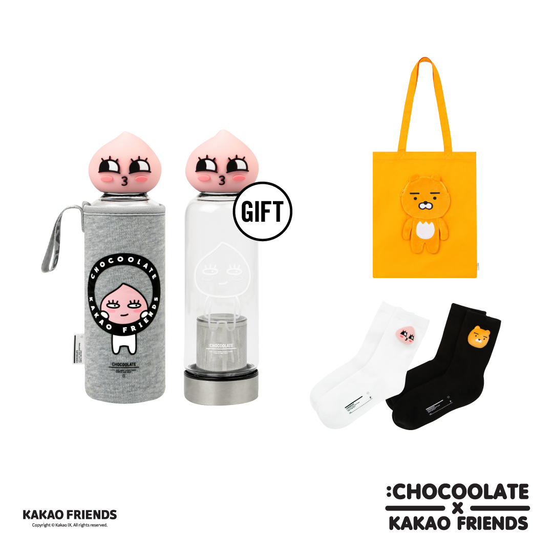另外,現在只要在全台:CHOCOOLATE 專門店購買兩件(或以上)指定單品滿 $3,600(其中需包括一件:CHOCOOLATE x Kakao Friends 聯乘系列產品),就可以免費得到:CHOCOOLATE x Kakao Friends Apeach 圖案的玻璃水瓶。一系列的聯名商品是不是超級療癒呢?10月11日就出發去:CHOCOOLATE購物一波吧!