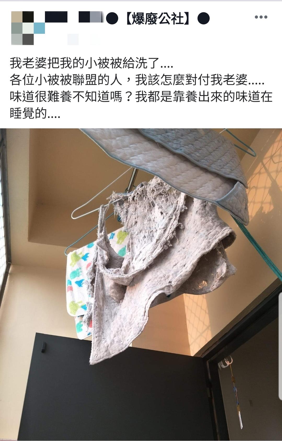 ▼原po表示:「我老婆把我的小被被給洗了,各位小被被聯盟的人,我該怎麼對付我老婆…味道不好養不知道嗎?我都是靠養出來的味道在睡覺的。」