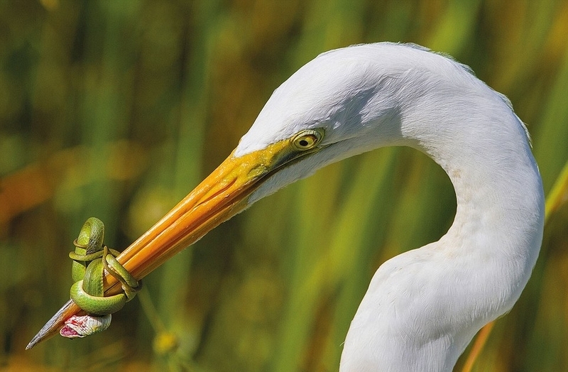 ▼這張照片是來自美國佛羅里達州邁阿密的何塞·加西亞(Jose Garcia)拍攝的。他說:「這個白鷺在佛羅里達大沼澤地里與一條綠蛇搏鬥了近20分鐘,而白鷺最後不得不放棄了牠的獵物。」