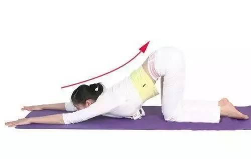 ▼貓伸展式:跪地,雙手和上半身儘量貼地,拉伸肩部及整個腰背部脊柱。能夠舒展筋骨,緩解肩背緊繃。