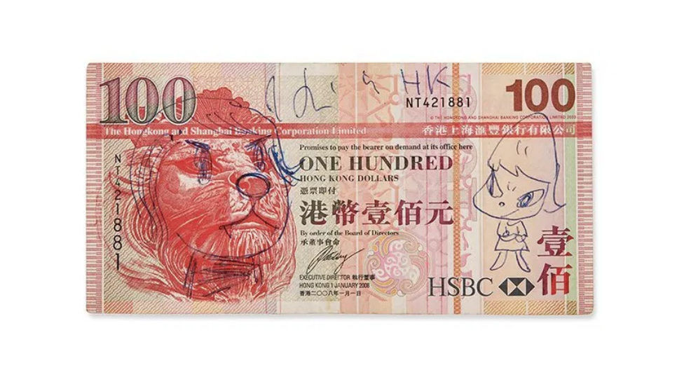 ▼這張紙鈔作品是奈良美智在2011年時的創作,當時她在一張2003年版、2008年發出的匯豐100元鈔票上用藍色原子筆畫了一些圖案,一個風格強烈的大眼小女孩和可愛版銅獅子。