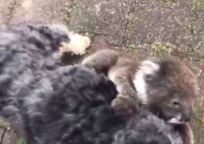 主人推測,這隻無尾熊寶寶可能跟媽媽住在附近的樹上,牠不小心掉下來,也許把Tony當成了媽媽,這才堅決不放手。主人被逗得哈哈大笑,最後幫狗狗把無尾熊抓下來,這隻大膽的無尾熊寶寶自己爬回了樹上。