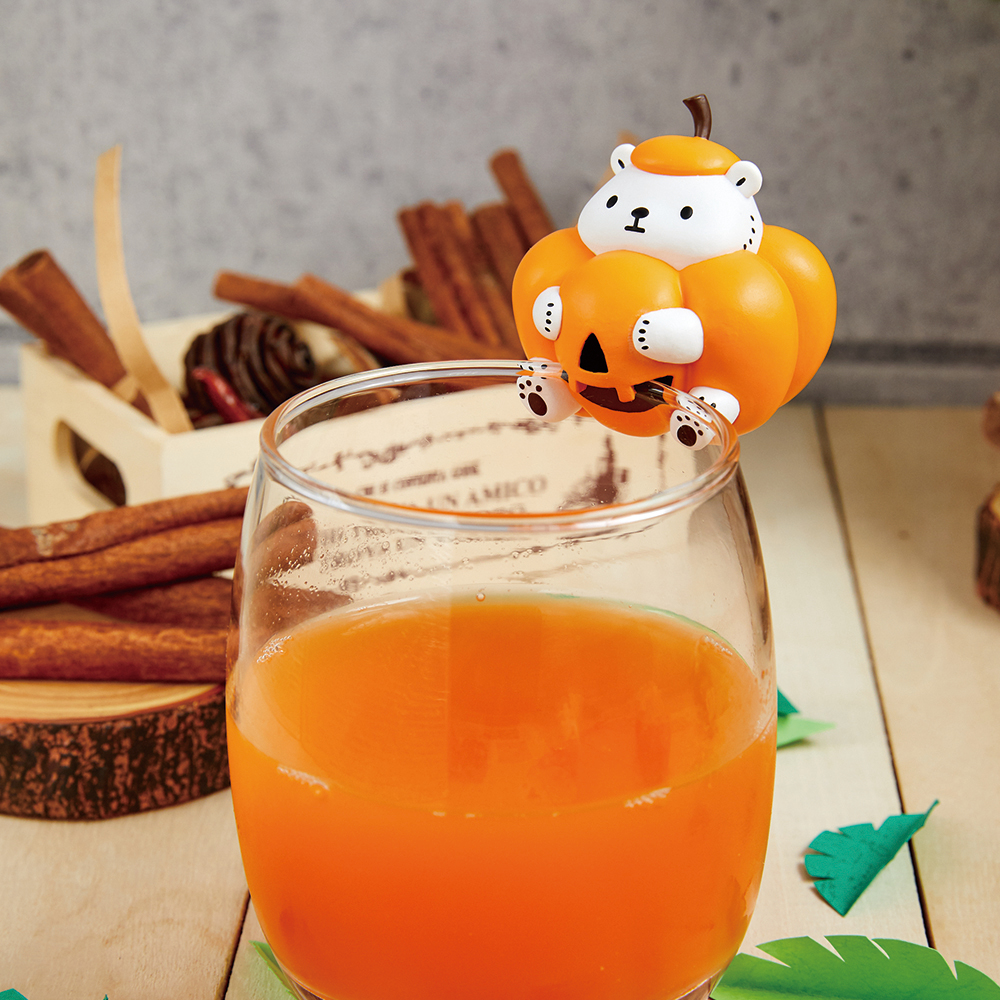▼本來就已經圓滾滾的白白,塞進南瓜裡,一整個更肥滿了,讓人超想咬一口。白白雙手遮住南瓜雙眼,看起來就像是在跟南瓜玩「猜猜我是誰」的遊戲一樣,用南瓜的兩顆牙掛在杯緣,這造型很欠揍。