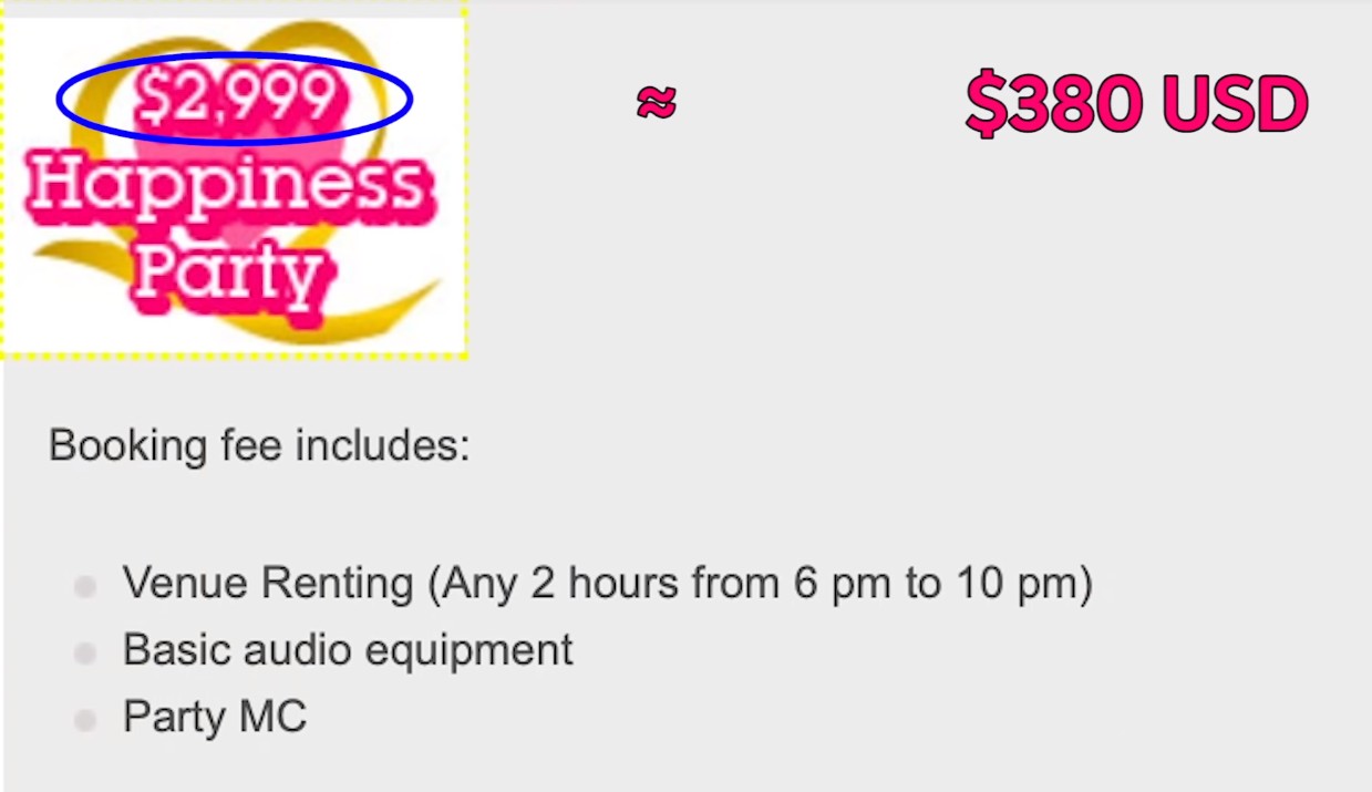 ▼其中最基本的「開心派對」配套只提供了會場2小時的使用時間、基本的音響設備和提供派對主持人;較為昂貴的「永浴愛河派對」則額外提供了氣球婚戒、氣球捧花、50封邀請函、50個客人的小禮物、許多氣球裝飾和一個蘋果派做成的蛋糕!