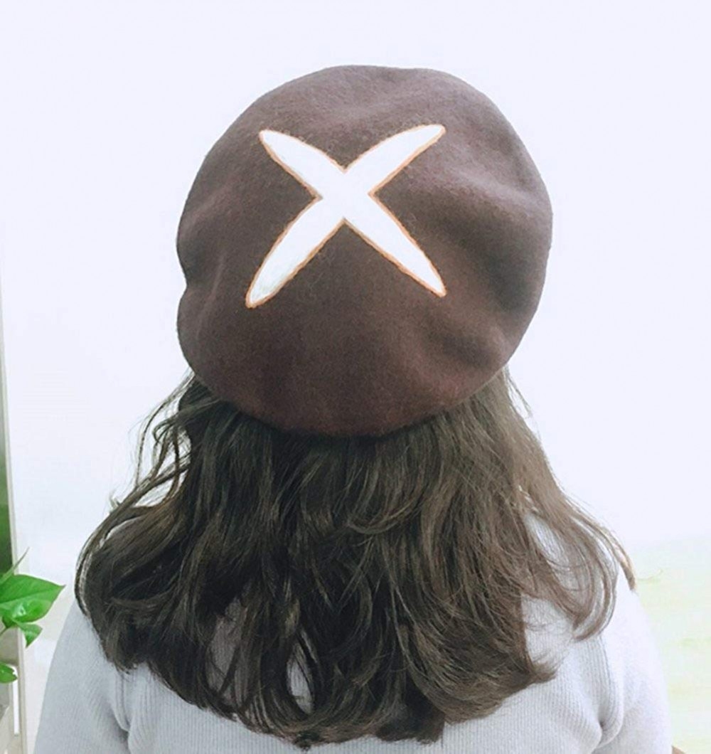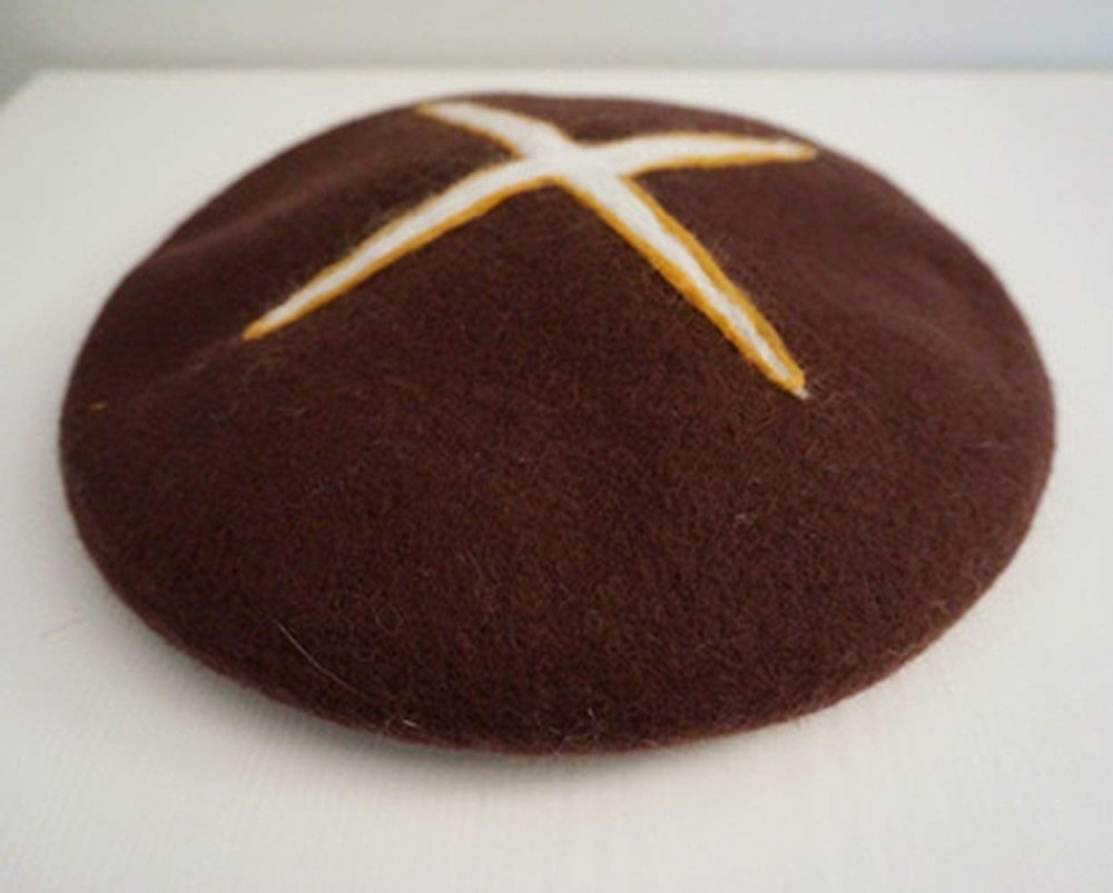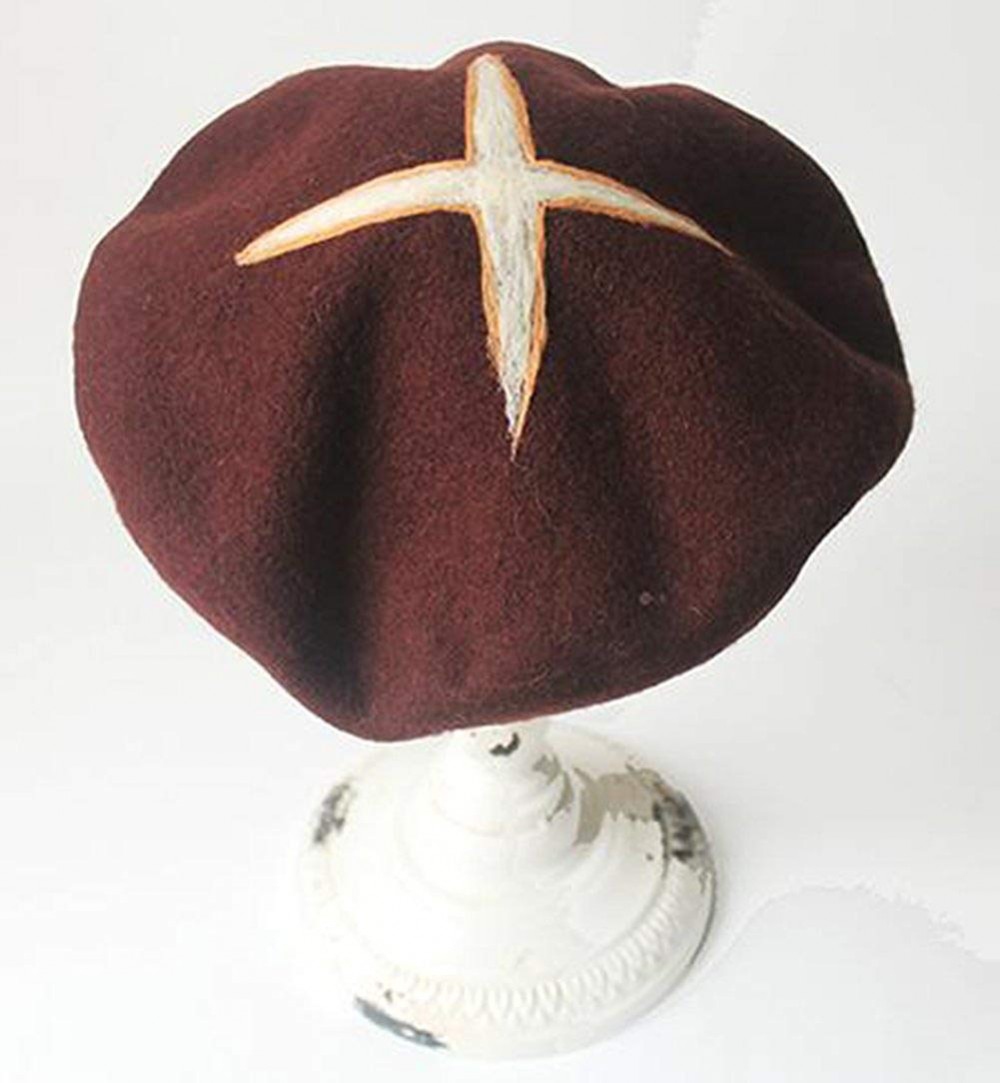 ▼這款貝雷帽是深咖色的,再加上帽子中間繡的白色十字架,是不是很像一朵可愛的香菇?