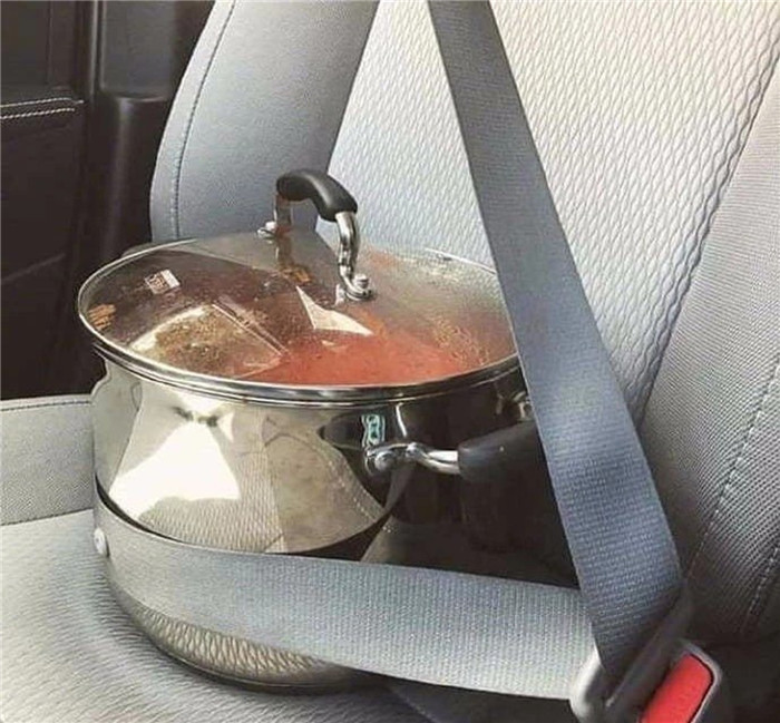 ▼原PO去完阿嬤家,臨走要他帶一鍋料理回家吃,但他開車不方便自己拿,放在車上又怕撒出來,於是他靈機一動,想到用安全帶把鍋子系起來,然後就呈現出照片上的一幕,鍋子被綁在座位上,畫面十分好笑。