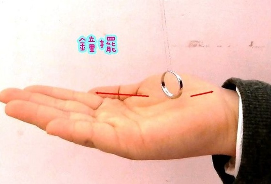 ▼用頭髮將戒指吊起來,當戒指停下來不再晃動時,將戒指懸空放在手心上方!