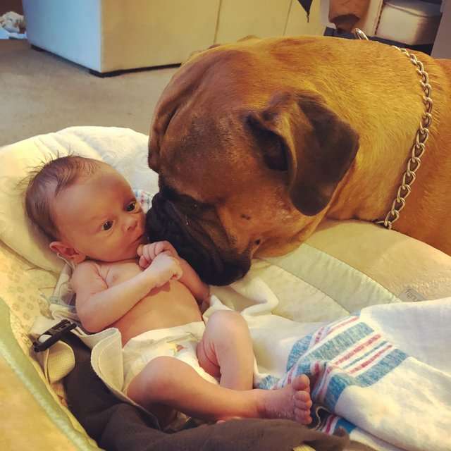 ▼在波妮生產時,布魯圖斯被寄放在家人那裡,等到凱登出生,波妮才讓他們兩個碰面。波妮本來還想介紹兩人「認識」,但布魯圖斯似乎立刻知道這是她小孩,「牠繞過我丈夫,想親吻凱登,想依偎在他身旁。」