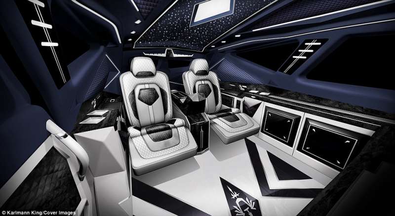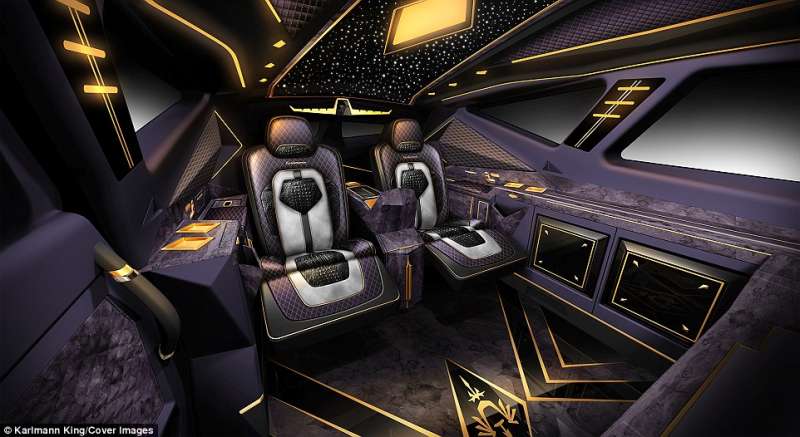 ▼內裝則是華麗到誇張的程度,除了全都由麂皮包覆外,還有折疊電視、咖啡機、空氣清淨機、遊戲機、香檳冰櫃等等,等於是把一個家庭視聽娛樂設備都搬進來了。