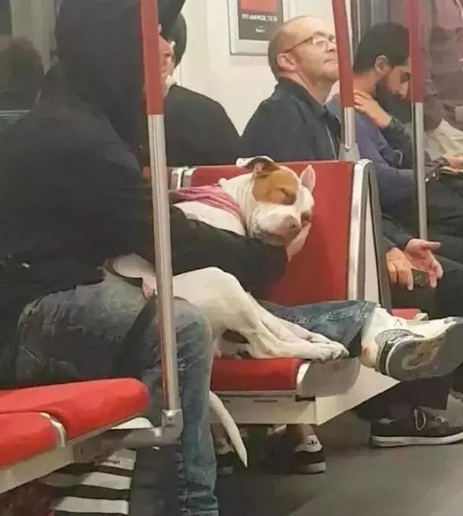 2019年10月12日人與動物之間的暖心互動,能夠給我們帶來很多感動。國外一名網友在地鐵上拍到了很特別的一幕。當時一位男子帶著狗狗搭地鐵,狗狗可能是玩累了,很快就睡了過去。主人沒有叫醒牠,而是用手托著牠的下巴,讓牠睡得更舒服一些。