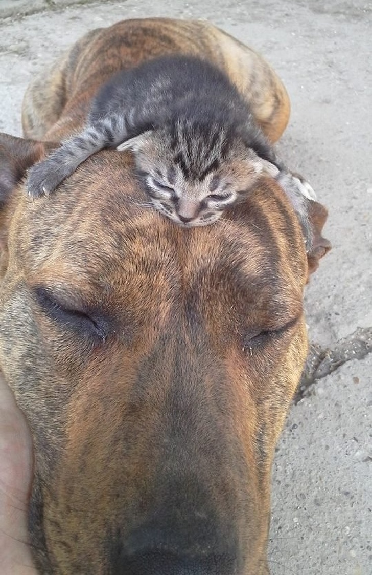 ▼趴在狗狗頭上是牠的樂趣!