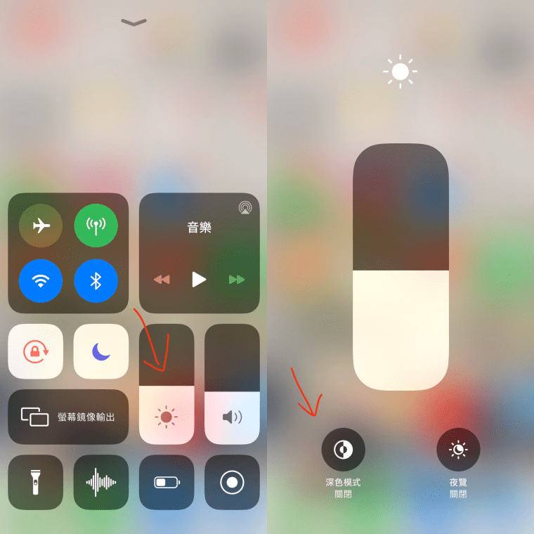 ▼2.深色模式:上滑開啟控制中心,在調整亮度的地方長按,就能調整深色模式了。