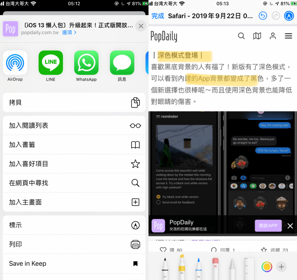 ▼愛閱讀的話,可以直接在網頁中使用「標示」功能,將喜歡的段落記下來。只要在網頁中按下「分享」>「標示」,就能直接畫重點,儲存成PDF或截圖了。