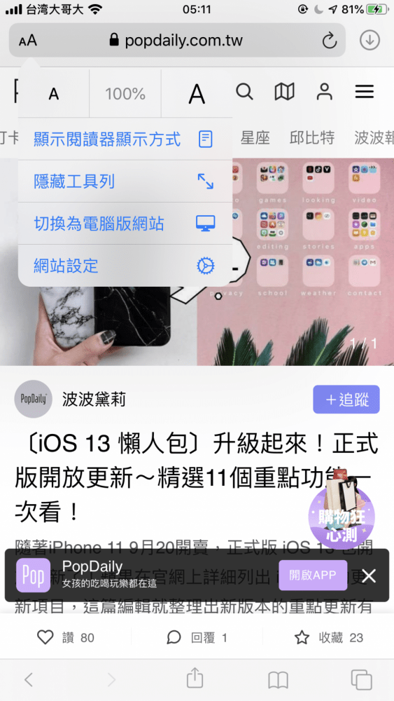▼10. Safari改版:點一下Safari左上角的Aa字樣,就能快速調整字體大小,還能切換成電腦版,並新增了下載工具,用起來跟電腦版一樣。