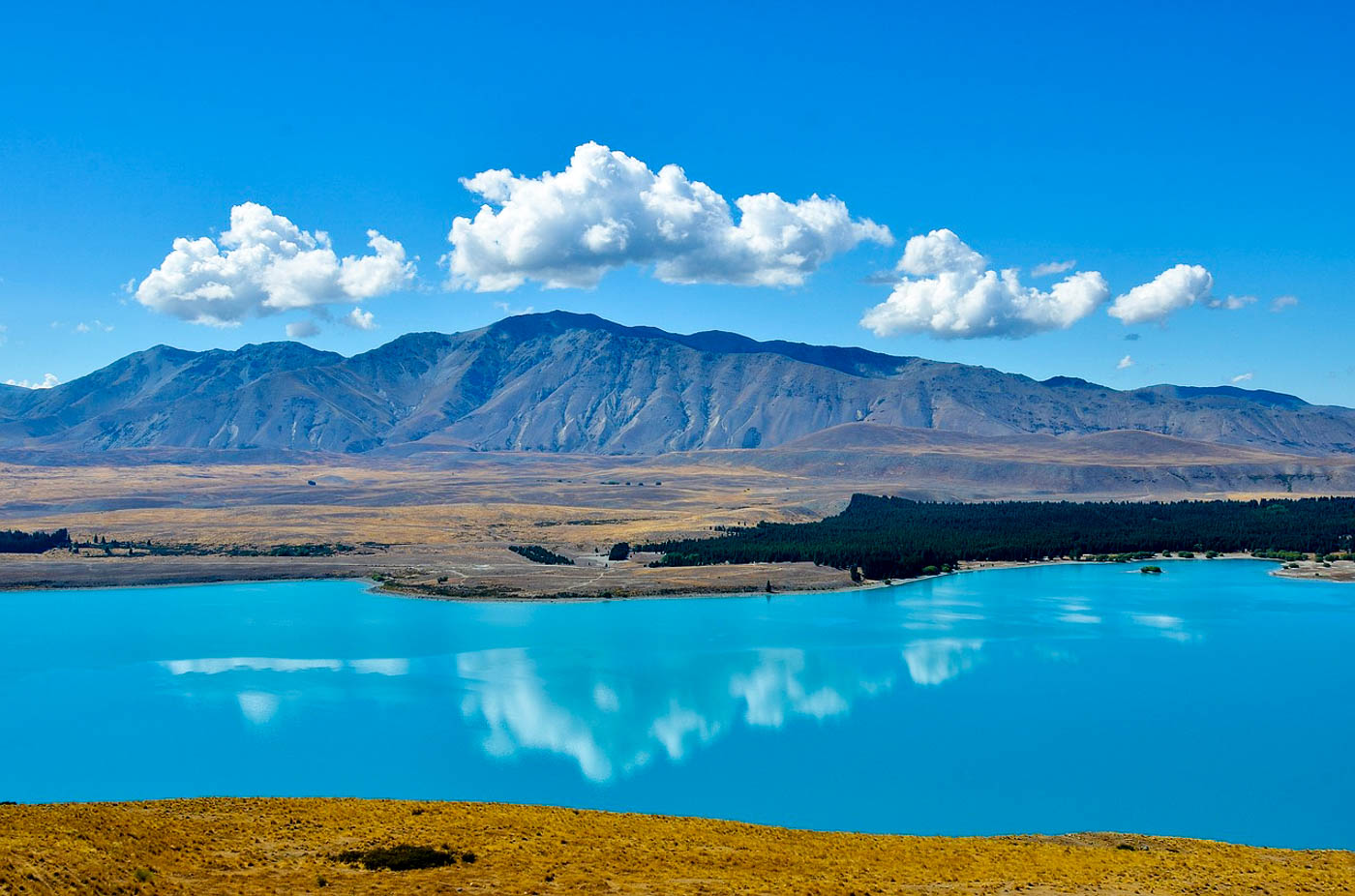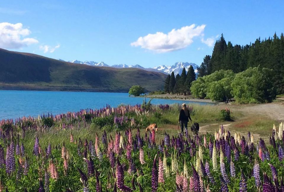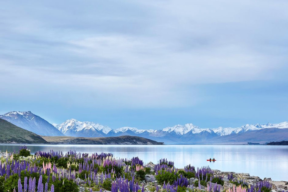 位於麥肯奇盆地的蒂卡波湖,可以看見藍天與湖水連成一線的美景,在這裡可以遙望對岸的南阿爾卑斯山,還有岸邊美得不真實的自然景觀!