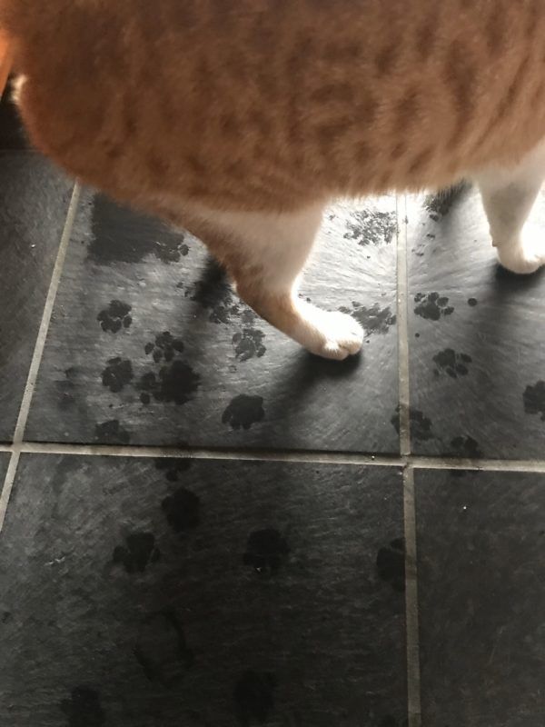 ▼貓咪在地板上留下一個個濕漉漉的梅花腳印,看起來很可愛。