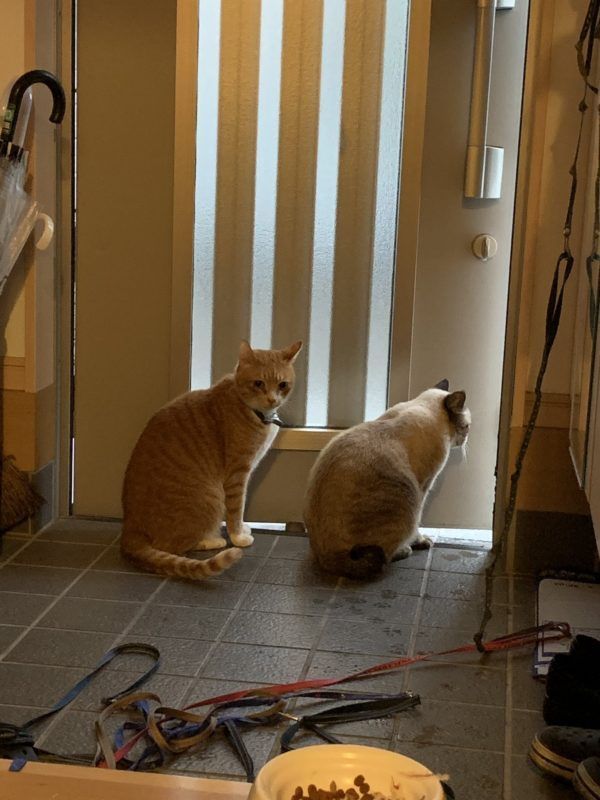 ▼1.室外風雨交加,家中的喵主子招呼浪喵進來避險。牠們一起坐在門口,觀察室外的情況。