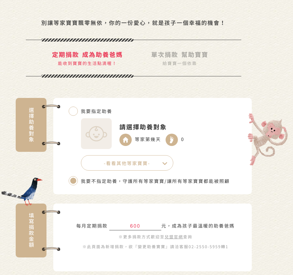 ▼如果大家願意當助養爸媽,他們的生活費和專業保母照護費等等的開銷都可以獲得保障!兒盟照顧這些等家寶寶已經超過28年,每年至少須籌募1500萬元才能給予百分之百的照顧。(定期捐款 成為助養爸媽)