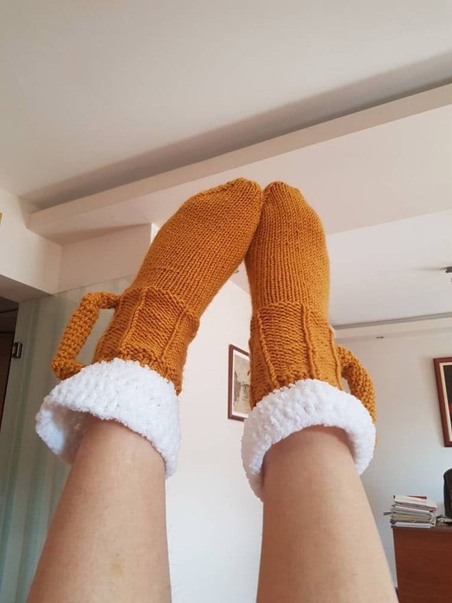 ▼先來看看這款超可愛的啤酒杯造型毛線襪。襪子做成了平時在美式餐廳中都能看到的超級啤酒杯造型。最特別的是,腳踝部分還有杯子把手呢~