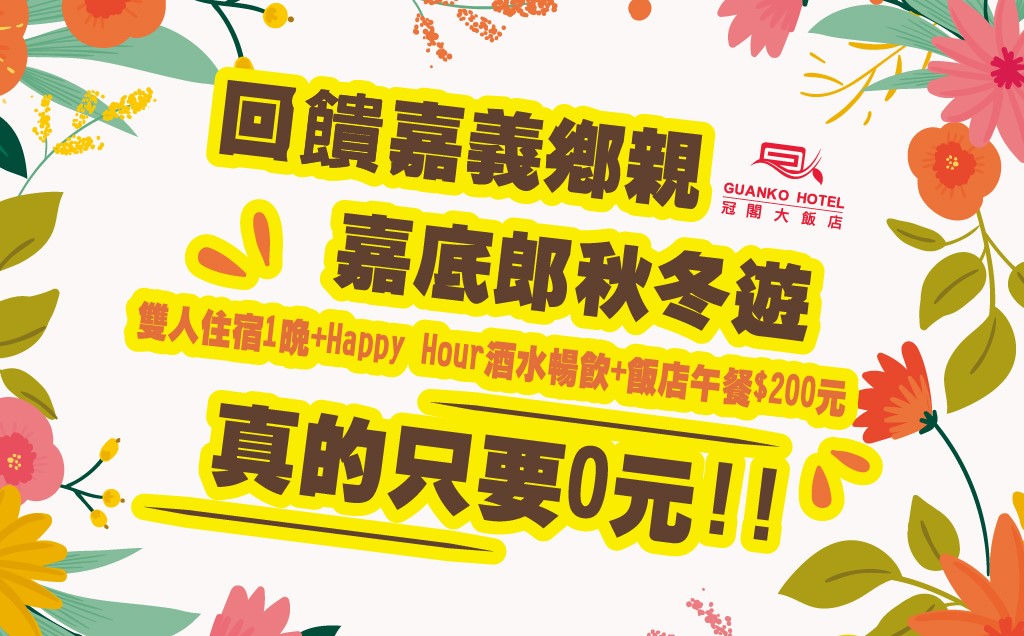 2019年10月21日秋冬國民旅遊補助正在進行中,大家有規劃好要去哪兒玩了嗎?為了因應國旅補助,嘉義「冠閣大飯店」特別推出回饋嘉義鄉親的「0元入住方案」!此外,嘉義市官方也特別與市內8家飯店合作,推出姓名中有「嘉」或「義」的旅客可享之特別優惠。