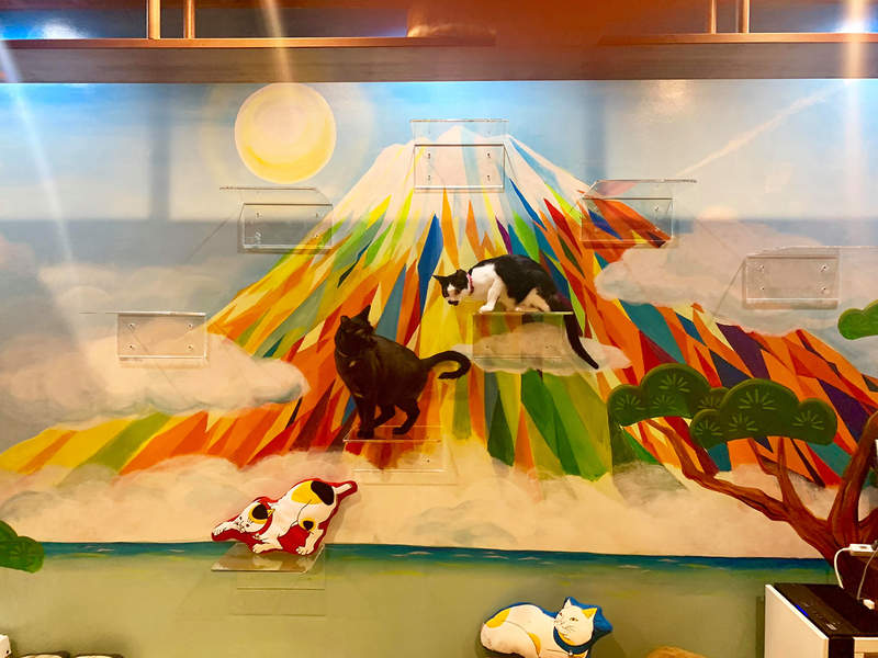▼店內的牆上也有澡堂中必出現的富士山壁畫,不過這裡並沒有提供真正洗澡的地方,而是讓貓咪來為大家進行「貓浴」!