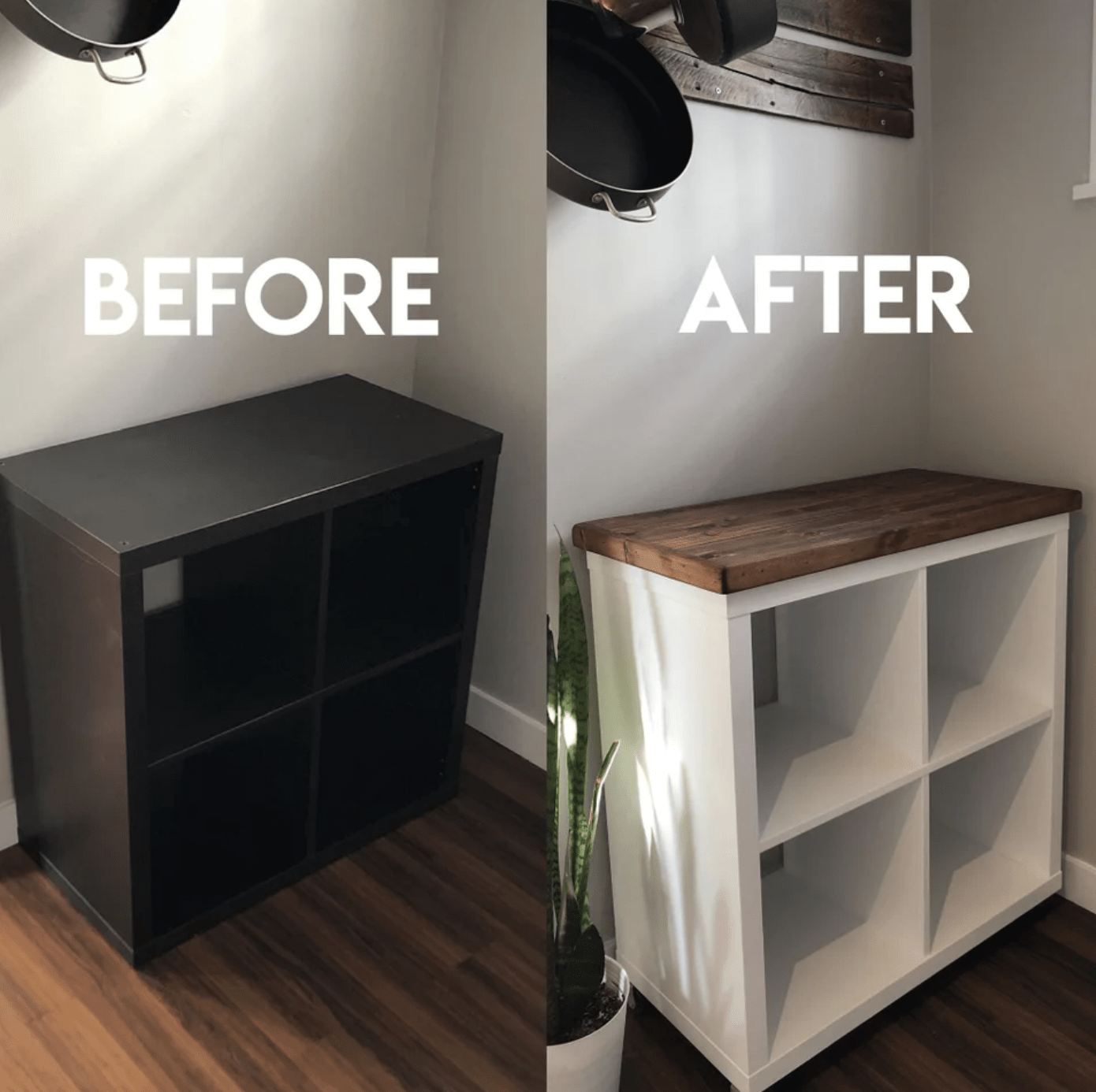 ▼原本平凡無奇的黑色櫃子,在上面加上一層木製的隔板,將櫃子油漆成白色的,最後在下面加了四個輪子,全部只花費了25美元(約新台幣765元)!
