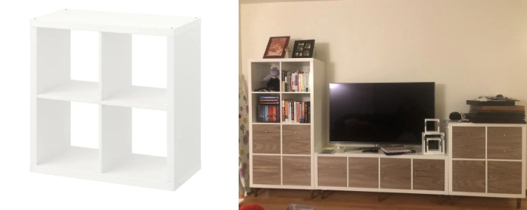 ▼他購買了3個這樣的 IKEA 櫃子(2x2 、4x1 和 4x2 各一)再加上14個桌腳,組裝而成了這樣的電視櫃!