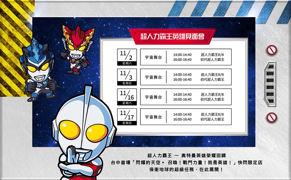 ▼另外,超人力霸王見面會也在這次台中站加開見面會場次,即將舉辦共八場超人力霸王見面會,11/2(六)、11/3(日)、11/16(六)、11/17(日),屆時會由備受粉絲喜愛的超人力霸王初代以及R/B輪番現身,凡於見面會當天消費滿500元,即有機會獲得上台合影券乙張,喜歡超人力霸王的粉絲們千萬別錯過了。