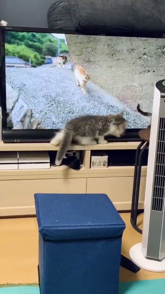 ▼看著電視中的貓咪不斷消失在螢幕邊緣,這隻好奇心旺盛的小貓竟然跟著跳到電視旁,開始模仿起「前輩走路」的模樣,讓主人都快笑翻了!