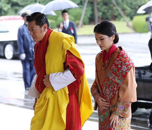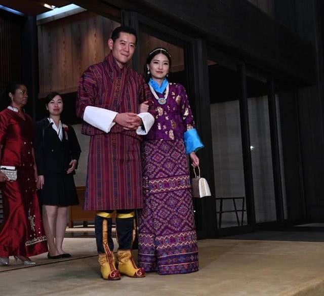 ▼在天皇的即位禮上,吉增佩瑪同樣穿著民族服裝。這一套衣服充滿異域風情,非常精緻。她挽著丈夫的手臂,臉上帶著淡淡的笑容,很有王后的風範。