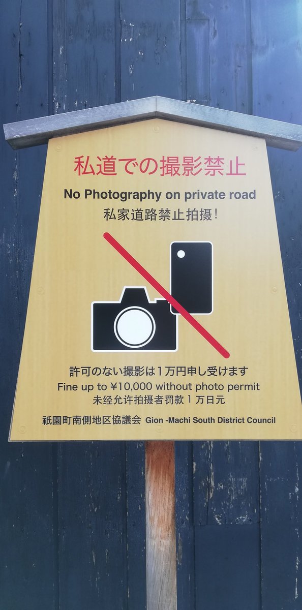 ▼10月25日,協議會在街道上豎起「禁止在私人道路上拍照」的告示牌,上面用中文、英文和日文寫著:「未經允許拍攝者罰款1萬日圓」。當地人也派發傳單,呼籲遊客不要在未經許可的情況下拍攝藝妓和舞妓的照片。