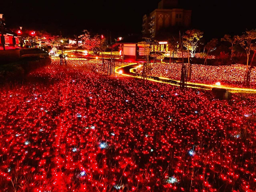 ▼除了用紅色LED燈佈置成大片的紅色星河以外,還運用了金色的LED燈點綴一旁的小徑,看起來就像是一道曙光降臨,光是試燈照片就讓人看了超級期待!