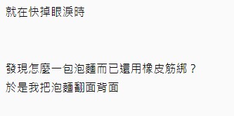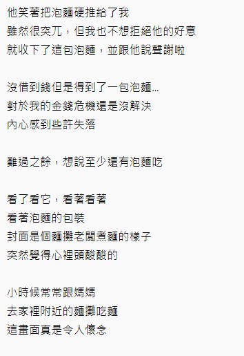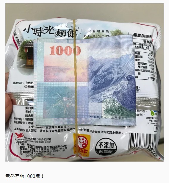 ▼最後原po也將泡麵收下了,因為這樣至少下一餐有了著落。當他看著泡麵想起小時候與母親一起到麵攤吃麵的畫面,不僅懷念起了家人的好。當他將泡麵翻轉過來時,卻發現原來泡麵背後夾著一張千元鈔票,「我整個人頓時傻住,接著湧上了開心與感動!我壓抑著內心無限的感謝,然後帶著這份無法言喻的心情先出門上班了!」