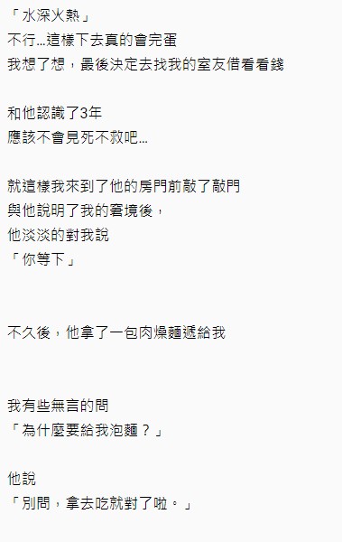 原po心想自己已經和室友認識了3年,應該不會選擇冷眼旁觀,於是鼓起勇氣向室友說明了自己的狀況。沒想到之後室友卻塞了一包泡麵給原po,讓他非常好奇「為什麼要給我泡麵?」室友卻霸氣表示:「別問,拿去吃就對了啦。」