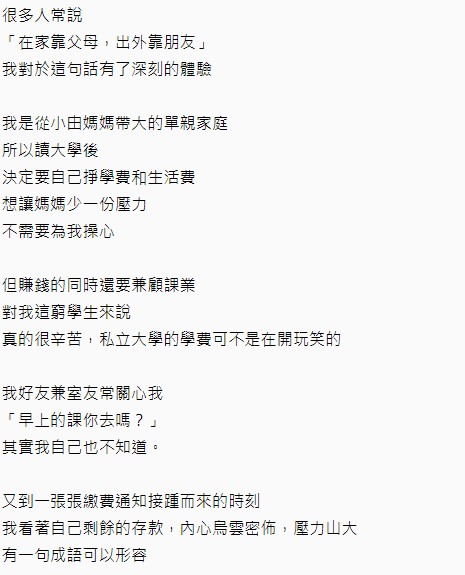 ▼原po在文中表示,來自單親家庭的他為了減少母親的壓力,於是決定要靠自己來賺取大學學費和生活費。不過在必須兼顧課業和賺錢的同時,也讓他的壓力非常大,當看到一張張繳費通知接踵而來的時候,由於剩餘的存款真的已經不夠支付,於是他決定向室友求助。