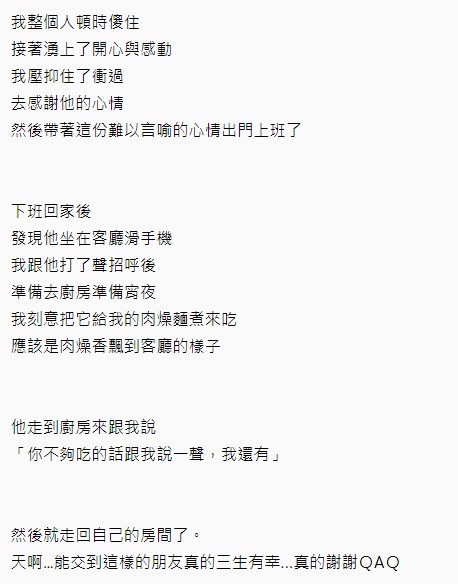 原po下班回家後,發現室友坐在客廳玩手機,向對方招呼一聲後原po就到廚房將那包泡麵煮來吃。這時候室友走到廚房對他說「你不夠吃的話跟我說一聲,我還有!」讓原po超級感動的表示「能交到這樣的朋友真的三生有幸!」